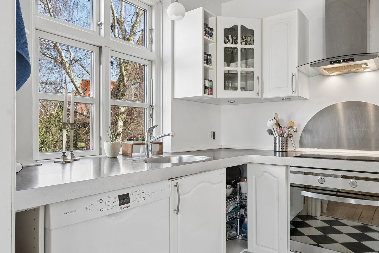 Lejligheden fremstår overalt i rigtig pæn og charmerende stand med flotte træ- og klinkegulve, hvide gipslofter og flere steder høje paneler.