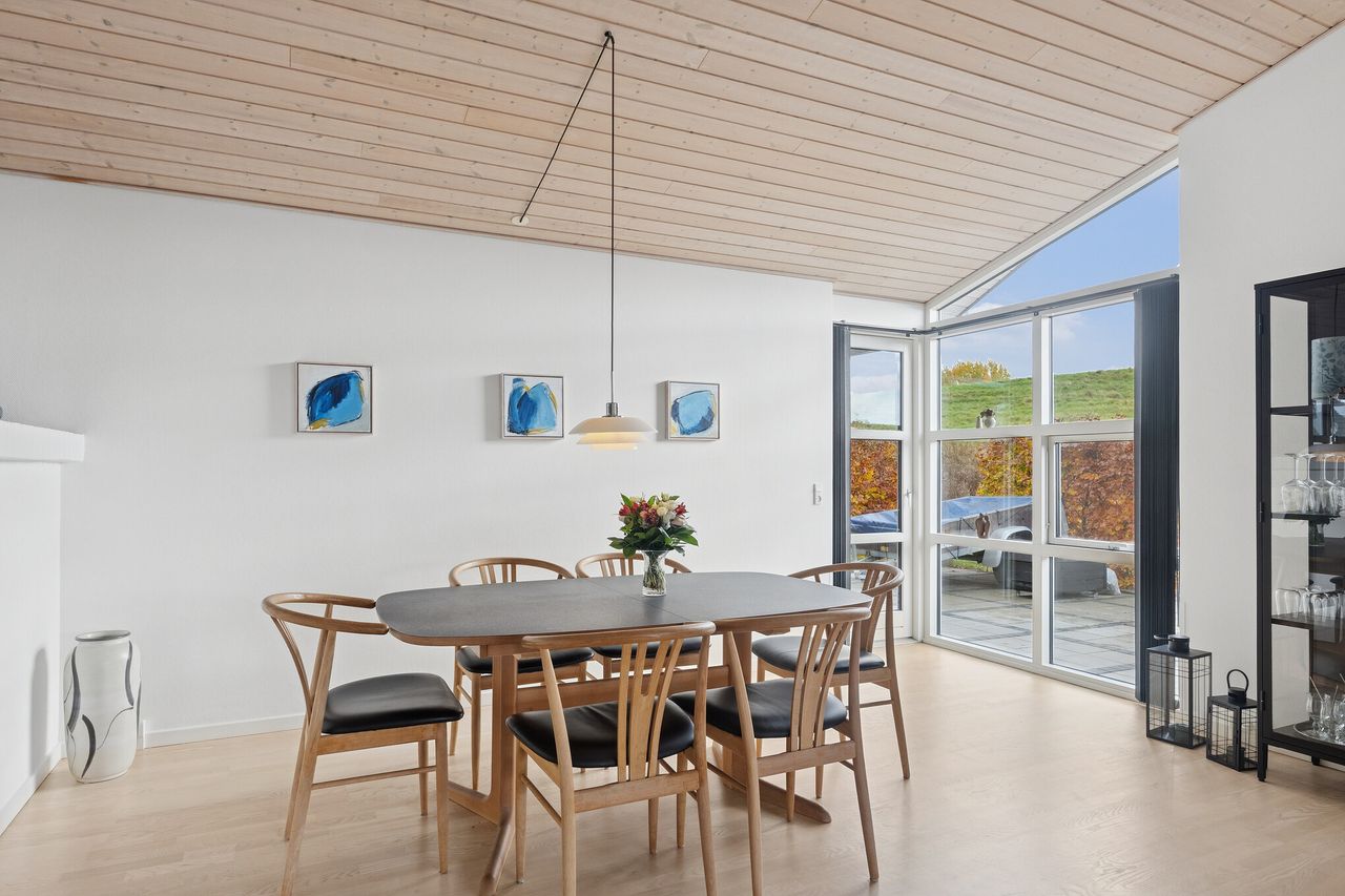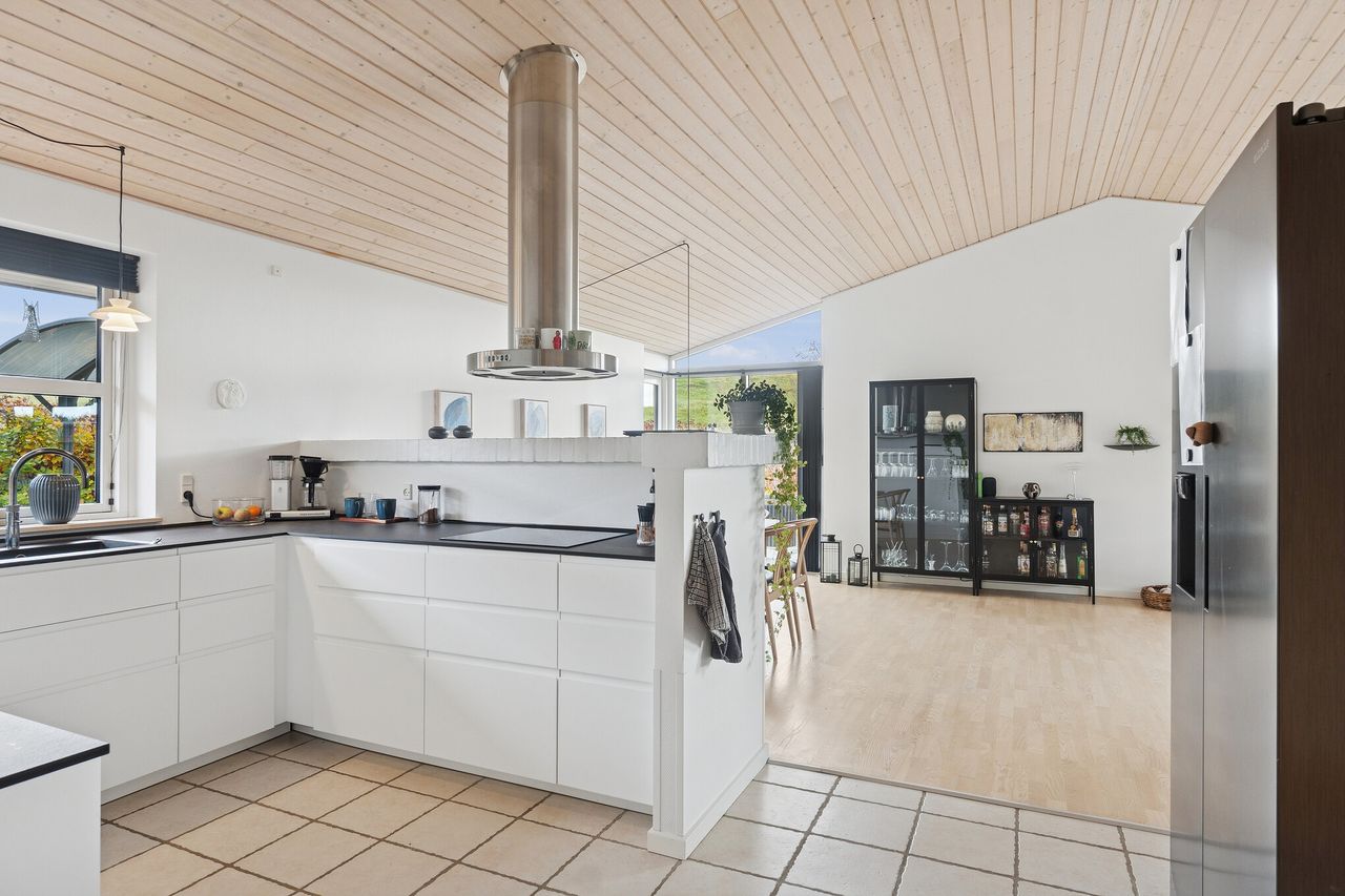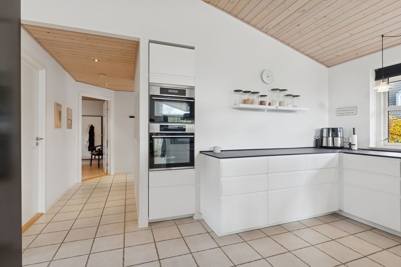 Listelofter overalt og trægulve i alle opholdsrum. Lyse klinker i bryggers, badeværelse og køkken.