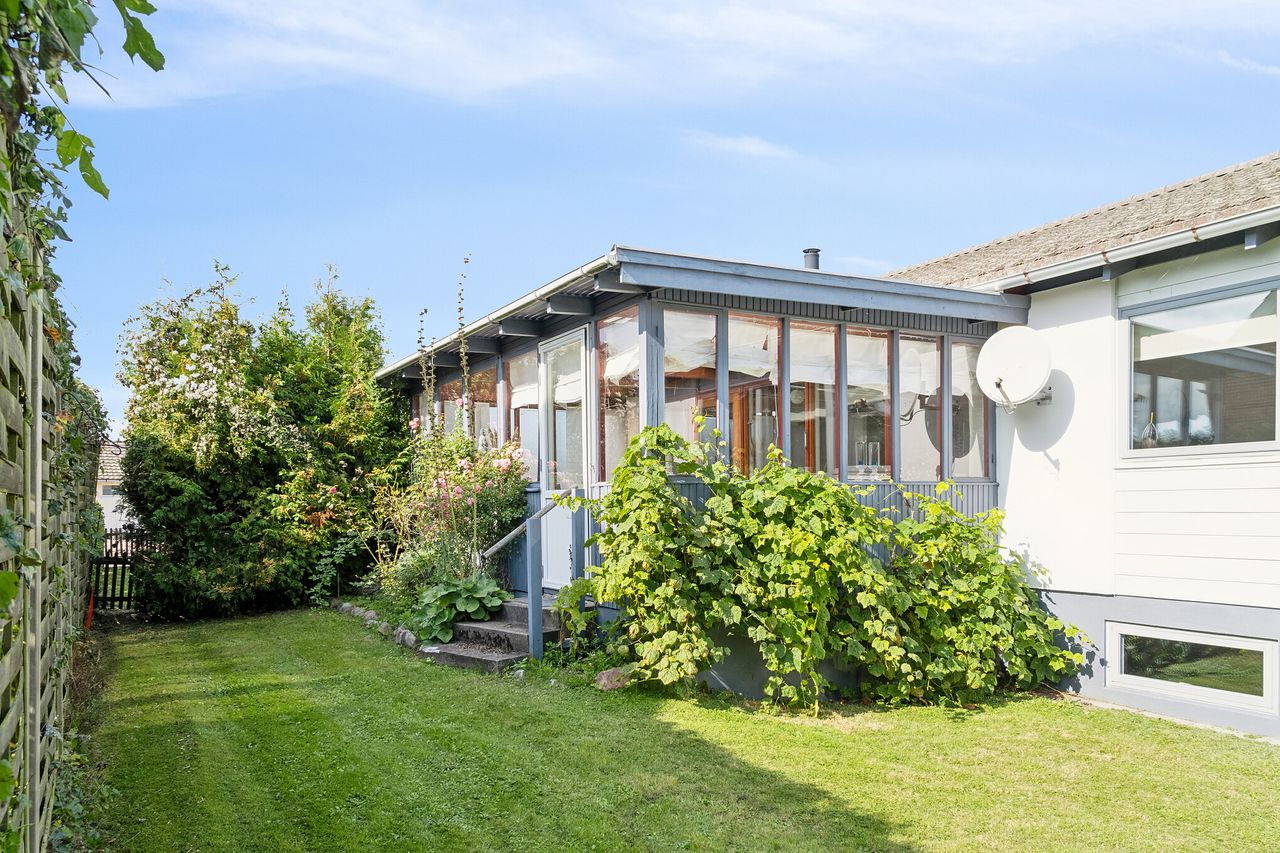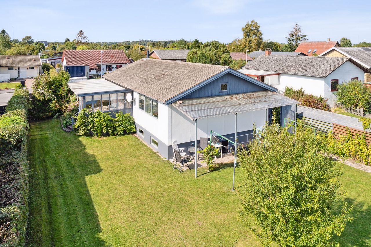 Haven omkring ejendommen er flot anlagt med buske, træer og en overdækket fliseterrasse – ideel for sommerens grillfester eller afslapning i solen. Derudover findes der også et mindre udhus på grunden, som kan bruges til opbevaring.