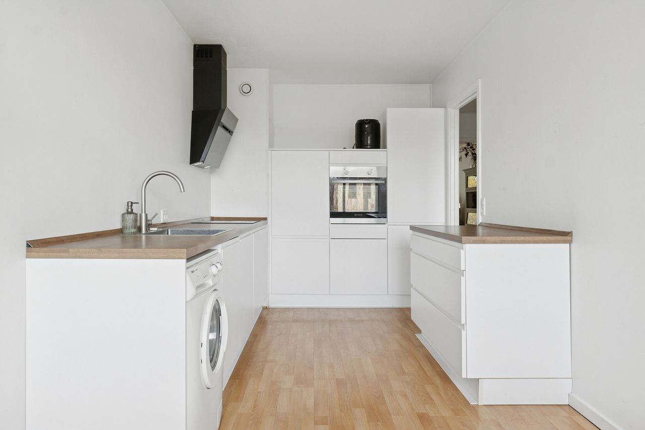 Entre/fordelingsgang. Pænt rummeligt køkken med hvide elementer og god spiseplads. Stor opholdsstue med udgang til terrassen. Badeværelse med kar og hvidt møbel. Herudover soveværelse og to værelser.
